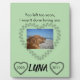 Cette création de souvenir significative allie sensibilisation et amour. Un fond vert citron audacieux représente la sensibilisation au lymphome, tandis que la photo centrale est encadrée dans un contour de cœur fait d'empreintes de pattes. Au-dessus de la photo, les mots « Tu es parti trop tôt, je n'avais pas fini de t'aimer » apparaissent dans une belle écriture Claudia, exprimant la profondeur de la perte. Sous la photo, le nom de l'animal est placé entre deux petits cœurs en forme d'empreintes de pattes, chacun contenant les années de naissance et de décès. La mise en page équilibre le souvenir, la guérison et la sensibilisation, créant un souvenir sincère pour les parents d'animaux endeuillés et un hommage à la lutte contre le cancer canin.