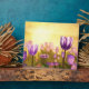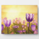 Un soleil doré se levant sur un champ de tulipes violettes.