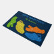 This fun and colourful doormat is ready to be customized with your own headline or slogan and your own name. The welcome mat features a colourful collage of plastic moccasin or clog style shoes in lime green, yellow, orange and bright blue against a navy blue background.