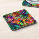 This plastic coaster set is shown in a colourful abstract diamond print.