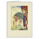 Cette carte de note enchante avec une image par Georges Barbier, 1925, l'où deux femmes et un enfant en bas âge travaillent dans un jardin. La copie est intitulée "La Terre" et rougeoie avec