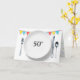 White plate and silverware place setting on white with colorful party flag banner for 50th birthday.