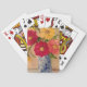 La peinture originale des zinnias colorés dans un vase bleu et blanc orne une plate-forme des cartes de jeu.