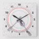 Designed for the modern kitchen, all granite and stainless steel, this wall clock features an illustration of a white enamel plate with red crackled glaze at the edges, and a thin red stripe around the border. The view is looking down from directly above the plate. A silver spoon and fork are on the plate, which sits on a white granite counter top textured with subtle colours. The black numbers on the clock can be cleared if you prefer a simpler, cleaner look. Matching Dishwasher Magnet available.
