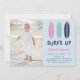 Les invitations à la fête d'anniversaire d'été pour votre petite fille surfeur en bord de plage avec un trio d'illustrations vintages de planches de surf en marine, rose et aqua. "Surf up" apparaît dans les lettres rétro, avec les détails de votre fête d'anniversaire en dessous. Ajoutez une photo préférée de la fille d'anniversaire pour une touche personnelle cool.