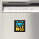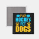 Hockey player magnet great for male and female hockey players, features hockey pucks, a hockey stick, dog paw prints, and text reads Play Hockey Pet Dogs!