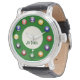 This watch features a set of coloured numbered pool balls, marking the time from 1 to 12 around the circumference of the clock, on a green bed. There's an inner circle of beige with a text placeholder for your name. Select a different watch style with the custom options.