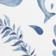 An elegant maritime pattern with playing blue dolphins and ocean waves. In between there are individual golden drops. Brings the ocean into your life.