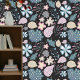 Infuse your home with warmth and character with our enchanting peel-and-stick wallpaper! The graphic style is a delightful blend of modern whimsy and classic elegance. Against a deep charcoal background, stylized flowers bloom in shades of pink, blue, teal, and cream. Leaves exhibit intricate patterns—some with polka dots, others with fine line work. These add texture and depth to the overall design. Remember, this peel-and-stick wallpaper is more than decor—it’s an expression of your unique style!