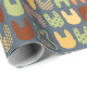 A pattern of abstract bunny-shaped silhouettes arranged in neat rows, featuring warm orange, yellow, olive green, and brown tones on a muted blue-gray background.