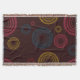 Cool, unique, trendy, urban abstract seamless illustration pattern art of colourful circles made with short, inclined lines. Modern and vibrant graphic design artwork. Pink, yellow and blue colours on dark red.