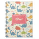 This personalized playful notebook features colourful, whimsical dinosaurs smiling in fun poses. A hand-drawn name label is in the centre of the design.