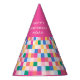 This party hat features a playful multicolor blocks pattern and the space to personalise with a name or a message for fun and cool children's birthday party celebrations.