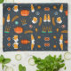 Fabric swatches in horizontal and vertical orientations display a playful pattern of orange pumpkins, candy corn, and white ghosts on a dark background.
