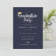 Playful white script with golden graduation cap accent, graduation party invitation. Features, navy blue colour background and single photo on back.