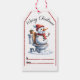 A whimsical holiday tag showcases a cheerful snowman dressed in a scarf and hat, sitting on a toilet. Perfect for adding a fun touch to Christmas gifts, spreading festive cheer.