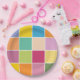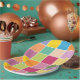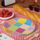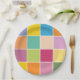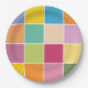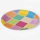 Colourful chequered paper plates are designed with various shades of yellows, orange, greens, lavender and blue.
