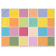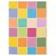 Colourful chequered tablecloth designed with various shades of yellows, orange, greens, lavender and blue.