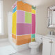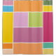 Colourful geometric blocks shower curtain designed with various shades of yellows, orange, greens, lavender and blue.