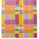 Colourful geometric blocks shower curtain designed with various shades of yellows, orange, greens, lavender and blue.
