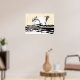 The Playful Stylized Ocean Jumping Dolphins At Sunrise poster print is part of the bathroom wall decor collection.