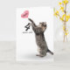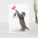 Grey tabby cat with pink heart balloon for 4th birthday on white background.