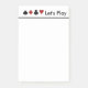 Post it note with a row of playing card symbols at the top. "Let's Play" text in black under the symbols and a line across .