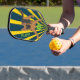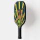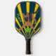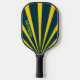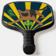 A retro-inspired design featuring a German Shepherd dog illustration ready to play with a green pickleball on a yellow and dark blue sunburst background. The pickleball paddle/racket can be customized with your name on the back, or you can add your dog's name as an alternative. If you're a dog lover and a pickleball enthusiast, then this design is for you.
