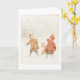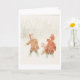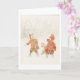 A vintage illustration of three children bundled up in matching red winter attire having a snowball fight in a heavy snowfall. Card is blank inside for your handwritten message.