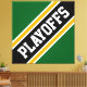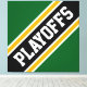 This sporty football design features athletic PLAYOFFS text inside highlighted wide diagonal black, white, and golden yellow racing stripes against forest green background. The colours and text in this design can be personalized.
