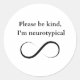 Add a touch of mindfulness and positivity to your everyday life with our "Please Be Kind, I'm Neurotypical" sticker. This thoughtful and meaningful design encourages compassion and understanding, serving as a gentle reminder to treat everyone with kindness. Perfect for laptops, notebooks, water bottles, and more, this sticker is a simple yet powerful way to promote empathy and inclusivity.