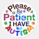 The message of “Please Be Patient I Have AUTISM” to understand and respect people with Autism and encourage kindness toward them.
