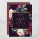 Our Plum Blossom wedding save the date frames your wedding details with an elegant square border of lush watercolor foliage and flowers in blush pink, burgundy plum purple and dusty blue, with real gold foil trim on a rich dark purple background.