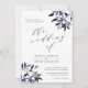 L'invitation de mariage rustique et élégante comprend des lettres riches en noir cassé dans le bloc chic et en italique avec des accents calligraphiques, avec des sprays de l'aquarelle feuillage de chute aux coins dans les teintes de récolte d'automne de prune violet et bleu minuit. Les invitations se renversent en bleu marine solide.