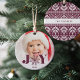 Sweet and festive holiday ornament features your favourite photo with "JOY" overlaid in burgundy plum lettering. A snowflake illustration takes the place of the "O." Personalize with the year beneath. Ornament reverses to reveal a festive Nordic sweater pattern.