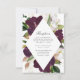 Cartes élégantes et élégantes pour l'enceinte de mariage avec détails de réception de mariage entourées d'un cadre de prune foncé et de fleurs d'aquarelle blanches accentuées de feuille d'or rose et de feuilles verts. Personnalisez la carte en ajoutant des informations importantes telles que l'heure de réception, l'emplacement, etc.