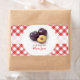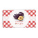 Customizable retro jar labels for homemade plum jam, prune jelly or preserves with fresh plums on red and white gingham tablecloth pattern.