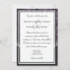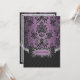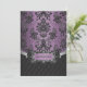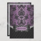 Plum Lapis Purple & Black Damask Wedding Invitations---match the RSVP cards found at the bottom of this page. Each invitation features an elegant, chandelier like damask print in black and purple at the top with a luxury pillow print, also in black at the bottom. The top and bottom half are separated by a silver and black ornamental band for added flair. The band has a template that allows the groom & bride's first names to be printed on top of it. These purple chandelier/black damask wedding invitations are set to high quality basic card stock; however, you can change the stock to linen, felt (embossed), recycled, and several metallic shades if you would like under number 2 (choose your style, size & paper type) below the orange add to cart button. A list of the additional costs for a fancier card stock are displayed also under that option. Each invitation comes with a fitted white envelope.