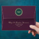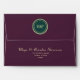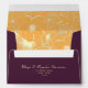 Modern, elegant, jewel tones plum purple and yellow 5x7 envelope for wedding invitations with gold floral lace inside, return address and emerald green monogram at the top flap.
