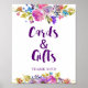 This plum purple garden cards & gifts wedding sign is perfect for a floral theme wedding. The design features bright magenta, pink, plum purple and blue flowers, and a lovely bold script font. The line of text at the bottom of the sign can be personalized with the date, the names of the bride and groom, or a short message like "Thank you". Designed with Care by Miriam at Fresh & Yummy Paperie. For coordinating items, please visit my Zazzle store: