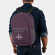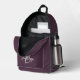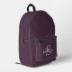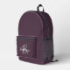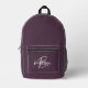 This personalized backpack features a monogram and first name in modern grey and white script on a stylish purple background.