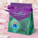 Elegant plum purple and vibrant emerald green, royal blue and teal blue peacock feather wedding favour boxes. You can add text in the font style, size and colour of your choice on this beautiful plum purple peacock wedding favour box.