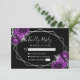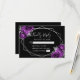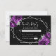 This elegant wedding RSVP card features a silver geometric frame decorated with plum and silver floral bouquets on a black background. The customizable text combines silver grey whimsical handwriting and copperplate fonts. The reverse side is solid black.