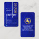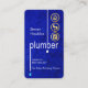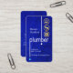 Cover features a blue water grunge design with a creative "plumber pipeline" signage. Your prestigious name is located on the left with an array of gold plumbing icons in the opposite direction. Near the base of the card are the contact details.