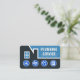 Cover features a white building frame with a leaking water wave design; Here lies your business name "PLUMBING SERVICE" which you can change. At the base of the card is an array of plumbing icon tools.