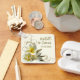 Key ring wedding favours with Hawaiian plumeria flowers and text on both sides. Square key chain is off-white with a leafy flourish and white frangipani flowers with yellow centres. Text is modern script in black with names and wedding date on one side, and “thanks for being here” text on the other.