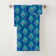 Serviette sertie dans un imprimé textile en plumes de paon - plumes d'aqua clair, avec un oeil dans les tons violet violet avec aqua et noir, sur un arrière - plan bleu cobalt profond