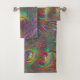 Ce somptueux ensemble de serviettes comprend un linge de toilette, une serviette de toilette et une serviette de bain. Vous pouvez choisir d'acheter l'ensemble complet ou de choisir laquelle des serviettes que vous souhaitez acheter. Le design présente une photo festive amusante de plumes de paon prises avec de la macro photographie. Des techniques de coloration artificielle ont été utilisées pour mettre l'accent sur les détails. Le résultat est un effet tinsel violet avec les oeillères montrant des nuances de rouge et de vert.