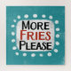 "More Fries Please" est un design de texte amusant avec une forme d'accent blanc entourée de points blancs texturés.