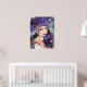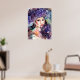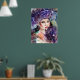 Purple hat and rainbow colours, a lady holds a feather fan. Poster.